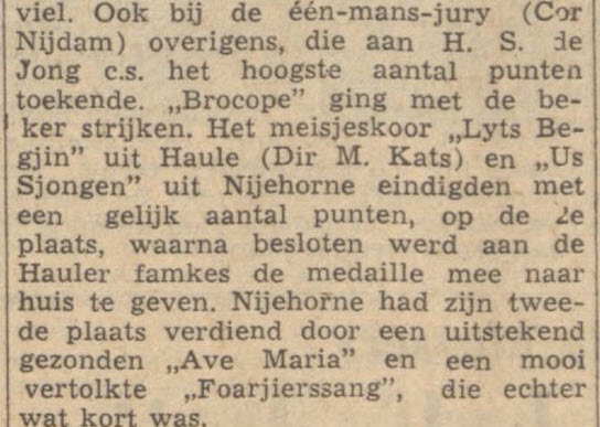 Het gemengd koor van Haule onder leiding van den heer J. Breider luisterde door enige zeer verdienstelijk gezongen liederen de bijeenkomst op. Na afloop spraken een drietal aanwezigen hun teleurstelling uit over de inhoud van de rede, die naar hun mening veel te weinig gefundeerd was op den bijbel en te veel op het socialisme. De belangstelling uit Donkerbroek was niet groot
