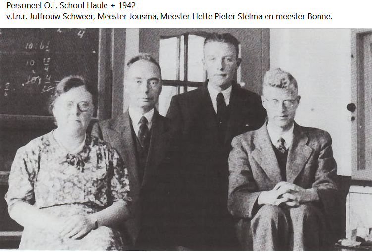 1922 Foto gemaakt naast de meesters woning. Op een lei geschreven Haule no 2. De Openbare scholen hadden geen namen maar nummers. Sjouwkje-Stelma de Groot vertelde: ‘Meester de Wit, kersepit, eierdop, kletskop. En dan was de meester kwaad!