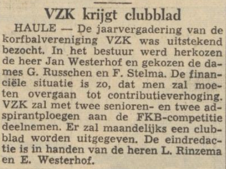 De korfbalvereniging V.Z.K.(Van Zessen Klaar) te Haule heeft dit weekend het vijftigjarige bestaan gevierd. Dat gebeurde met een druk bezochte receptie op zaterdagmiddag in het dorpshuis De Mande, waarna ’s avonds het toneelgezelschap Tryater optrad met „Ik wol Mollema to wurd” en zondags werd er een toernooi voor achttallen adspiranten uit Ooststellingwerf gehouden en was er tevens een propaganda-wedstrijd tussen het Ooststellingwerfs twaalftal en L.D.O. uit Terwispel.
