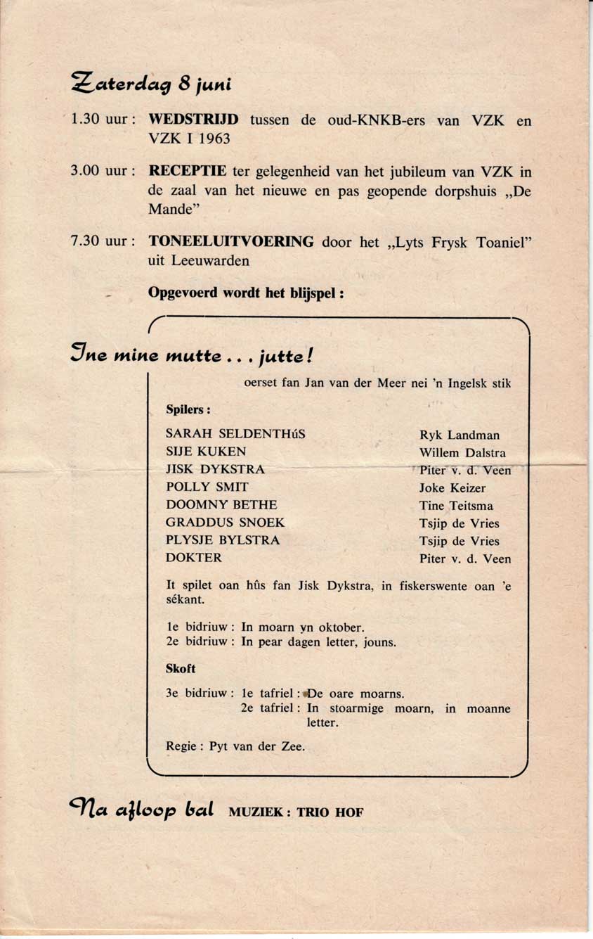 V.Z.K. vierde op 8 juni 1963 o.l.v. Hette Stelma, oud-lid, zijn 40-jarig bestaan met een receptie voor o.a. leden en oud-leden in het nieuwe dorpshuis “De Mande”