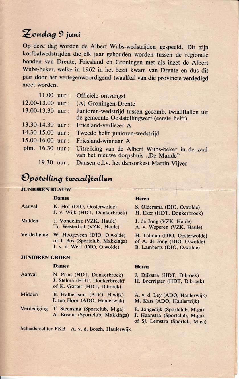 Ter ere van het 40 jarig bestaan van korfbalvereniging werd te Haule het Albert Wubs Beker toernooi gehouden. De jaarlijkse krachtmeting tussen de 12 tallen van Friesland, Groningen en Drenthe werd gespeeld in Haule. De spelers van de F.K.B wonnen de beker terug van de Drenten. Detail, in het Friese 12 tal was Haule ook vertegenwoordigd door een speelster van V.Z.K. namelijk Coba Middel.
